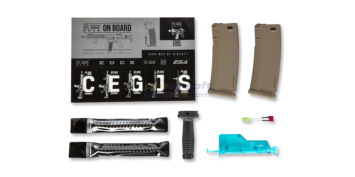 🟠 Paketti sisältää 2× S-MAG mid-cap lipasta, pystykahvan ja kuulien pikalataajan.
