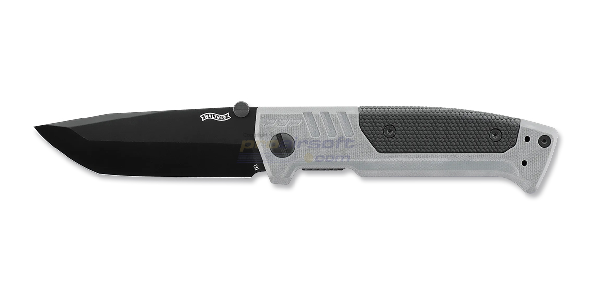 Walther PDP Tanto Serrated Folding Knife — D2 Steel, Partially Serrated, SandWalther PDP Tanto – Grey D2 Steel Folding Knife with G10 Handle and Deep Carry Clip